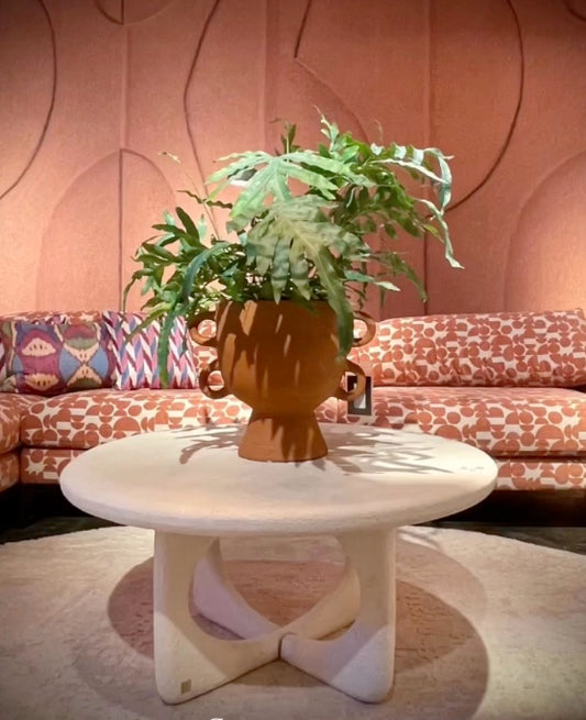 Yenn Salontafel Terracotta De Yenn salontafel in Terracotta is een stevige industriële salontafel gemaakt van met glasvezel versterkt beton en een glazen tafelblad. De poot van de tafel is afgewerkt met een oude brons finish wat de tafel een robuust uiterlijk geeft. Specificaties: Afmeting:...- €529,00