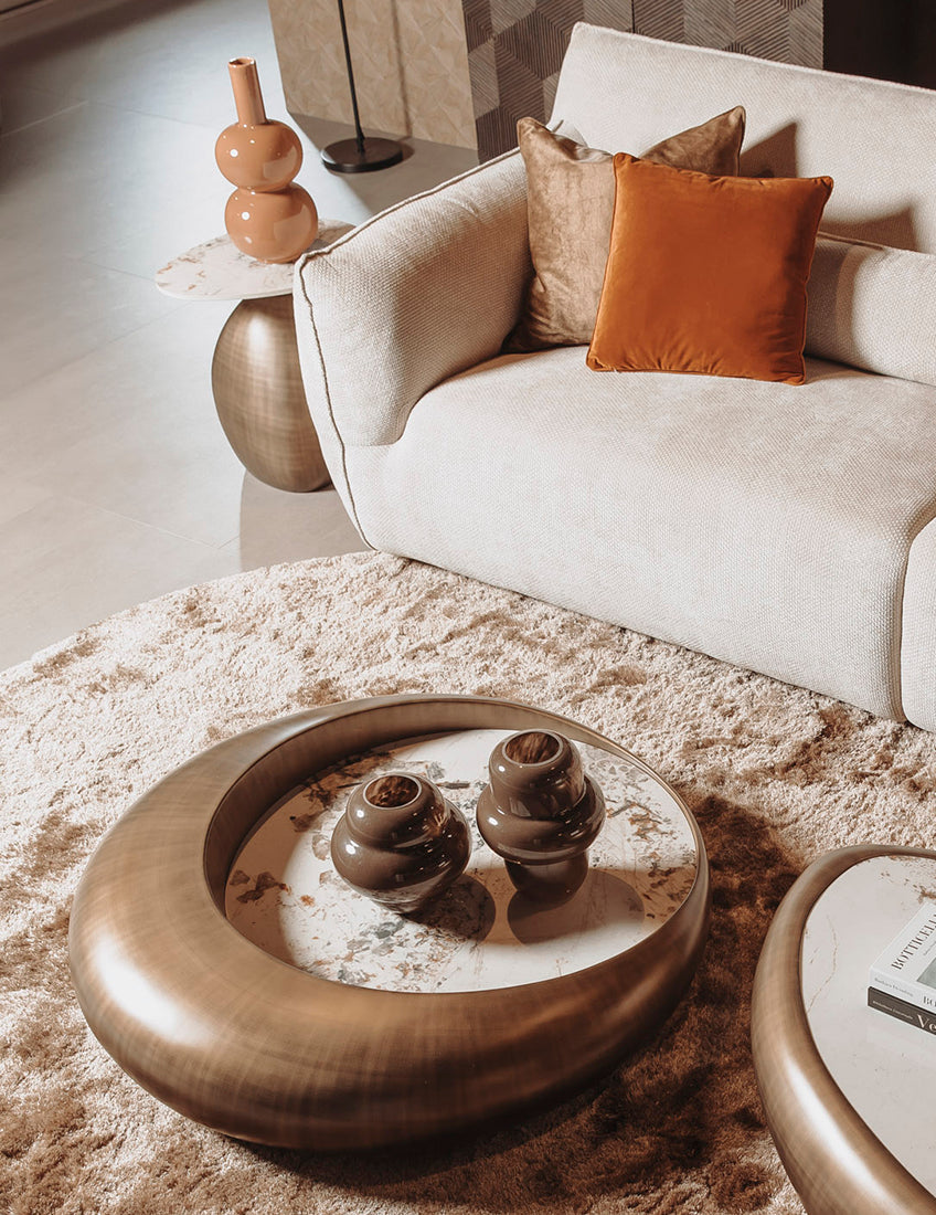 De Sintered Stone tafelbladen worden gecombineerd met een trendy design onderstel, gemaakt van fiberglass en afgewerkt met een mat bronzen finish. Bij deze tafels is het niet aan te raden om op de rand van het blad te leunen omdat deze dan kan breken.