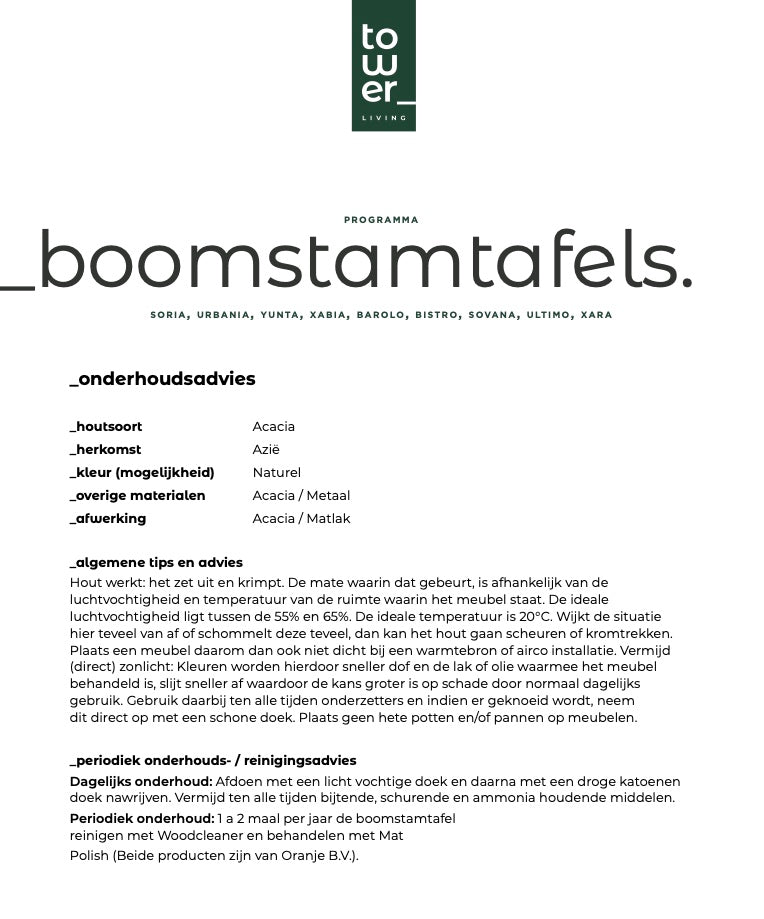 Het tafelblad is gemaakt van acaciahout, waarbij de natuurlijke contouren van de boomstam aan de zijkanten behouden zijn gebleven. Hierdoor is elke tafel een uniek exemplaar met een eigen verhaal en een warme, levendige uitstraling.