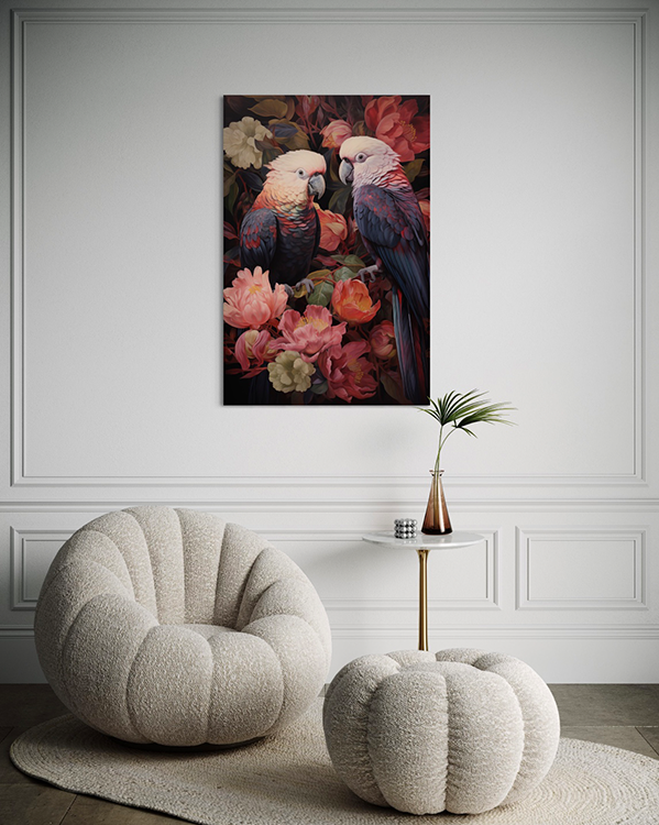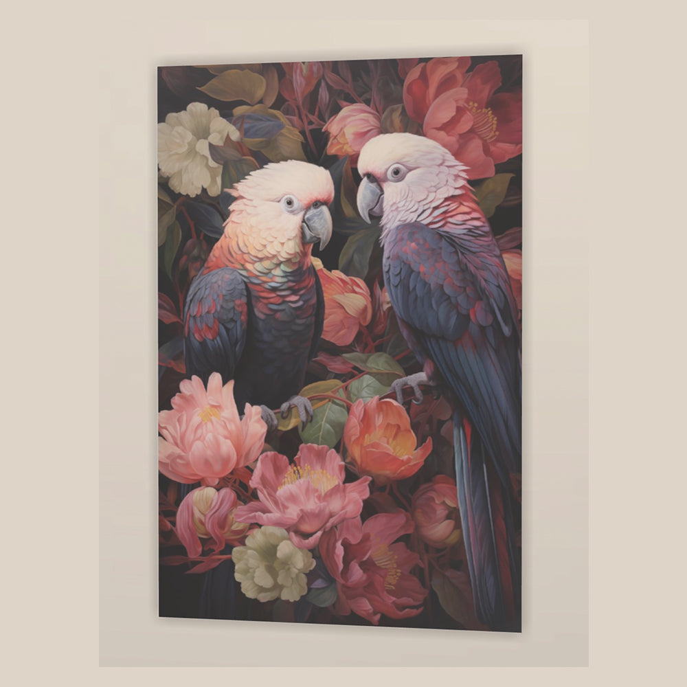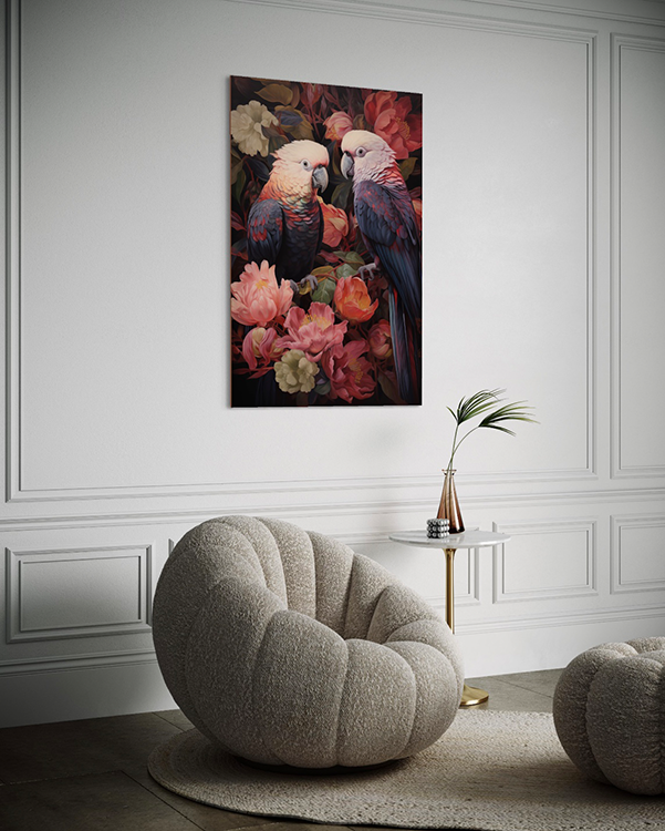 Deze papegaaien op plexiglas is een wanddecoratie met rustige en warme kleuren. Door het plexiglas zijn de kleuren levendig en de print haarscherp.