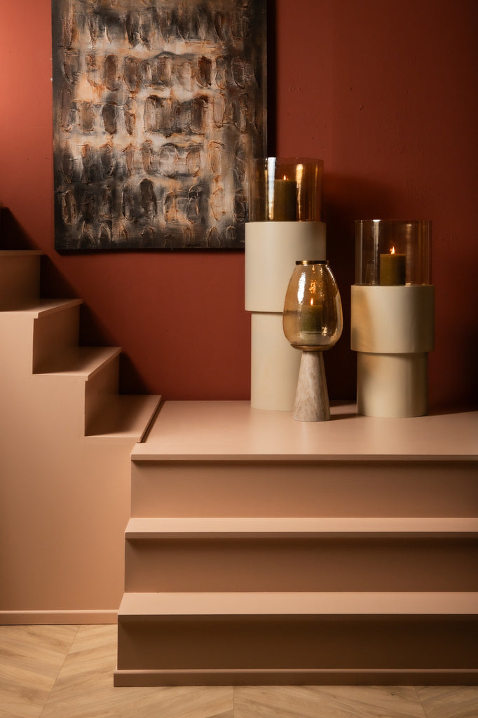 Dit Soon Windlicht 99 cm is een handgemaakt windlicht met een hoogte van maar liefst 99 cm. Dit moderne windlicht is uitgevoerd in een cream kleur en een getint glazen stolp.