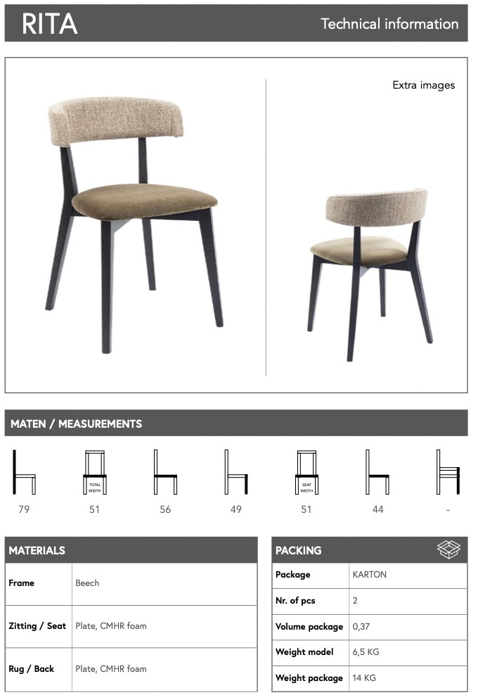 Stoel Rita is een robuuste stoel met een stevig onderstel van hout. Voor het frame kunt u kiezen tussen beuken zwart, wengé of smokey grey. Voor de bekleding zijn heel veel mogelijkheden.